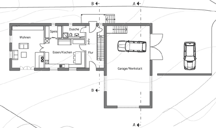 | Das kleine längliche Grundstück grenzt mit einer Schmalseite an eine dicht befahrene Bundesstraße. Der Entwurf beinhaltet ein nach Süden orientiertes, lang gestrecktes Wohnhaus und eine quer dazu liegende Werkstatt im Osten, die den Lärm der Straße vom Wohnbereich abschirmt. Die architektonische Haltung nimmt Bezug auf die umliegende dörfliche Struktur (Wohnbau mit angebautem Wirtschaftsteil). |