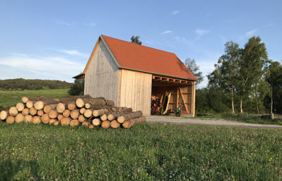 Für einen landwirtschaftlichen Biobetrieb wurde eine neue landwirtschaftliche Scheune als Ersatzbau errichtet. Das urspügliche Gebäude ist durch Brandstiftung zerstört worden. Zweck des Gebäudes ist die Unterbringung von landwirfschaftlichen Geräten. Um dem naheliegenden Schrankenbach bei Hochwasser Platz zu geben, gibt es auf der Bachseite nur einen Unterstellplatz unter einem großen Vordach.