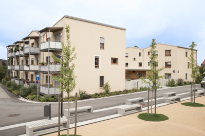 Die städtebauliche Anordnung der neuen Baukörper um zwei öffentliche Plätze ist im Vorfeld über einen Bebauungsplan durch die Stadt Ebersberg geregelt worden, der auf dem Ergebnis eines Plangutachtens aufbaut. Die Neubauten wurden in zwei Bauabschnitten realisiert, um den Bestandsmietern, die im Quartier verbleiben wollten, ein „Zwischenquartier“ bis zum Umzug in den Neubau zu ersparen. Insgesamt entstanden so 32 Wohnungen in verschieden Größen und Wohnungstypologien für unterschiedliche Zielgruppen (Familien, Alleinerziehende, Senioren). Die Wohnungen entsprechen den Wohnraumförderbestimmungen in Bayern und sind altengerecht bzw. barrierefrei ausgeführt. |
