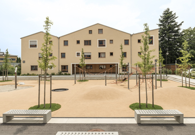 Die städtebauliche Anordnung der neuen Baukörper um zwei öffentliche Plätze ist im Vorfeld über einen Bebauungsplan durch die Stadt Ebersberg geregelt worden, der auf dem Ergebnis eines Plangutachtens aufbaut. Die Neubauten wurden in zwei Bauabschnitten realisiert, um den Bestandsmietern, die im Quartier verbleiben wollten, ein „Zwischenquartier“ bis zum Umzug in den Neubau zu ersparen. Insgesamt entstanden so 32 Wohnungen in verschieden Größen und Wohnungstypologien für unterschiedliche Zielgruppen (Familien, Alleinerziehende, Senioren). Die Wohnungen entsprechen den Wohnraumförderbestimmungen in Bayern und sind altengerecht bzw. barrierefrei ausgeführt. |