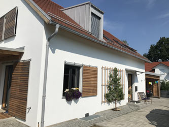 | Das kleine Haus steht im Zentrum eines niederbayerischen Dorfes. Die Bauherren, ein Lehrerehepaar, wünschten sich viel Platz für die beiden Kinder und für die zahlreichen Hobbys. Die große überdachte Terrasse im Süden wird in der warmen Jahreszeit wie ein zusätzliches Zimmer genutzt. |
